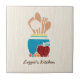 Add a touch of hominess to your kitchen with this cute country style tile featuring a hand drawn style set of wooden spoons and kitchen utensils in a turquoise pot surrounded by a delicious red apple and fresh fruit. This country kitchen themed design on a light wood pattern background can be personalised by adding your name.