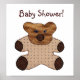 A cute country style patchwork quilted brown teddy bear. Printed pattern, not actual material. Text reads: Baby Shower!