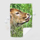 A beautiful cute calf lying in long grass with his tongue sticking out.