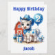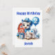 A cute cowboy pony is celebrating his second birthday with a blue balloon with the number 2 and a blue cowboy hat on a farm. Personalise the card with your child's name.