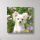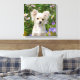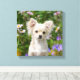 A young long-haired cream white coloured Chihuahua dog sitting in a flowering garden, photo taken by Katho Menden. This gloss wrapped canvas photo print is a gift idea for dog lovers. http://www.zazzle.com/kathom_photo