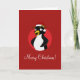 Customisable Christmas card with an illustration of a cute crested penguin with a red Santa hat; Christmas holiday cartoon design for kids, editable template design with custom field for your own text, illustrated by Radka Kavalcova