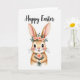 This card features a long-eared bunny centered on a white background, drawn with soft warm-brown fur, pink inner ears, and gentle shading that makes it look cuddly 🐰. Its big brown eyes and tiny pink nose create a tender, friendly expression, with a faint blush on the cheeks that suggests a shy sweetness. A small flower crown rests on its head, mixing blush-pink roses with fresh green leaves, like it’s dressed up for someone special 🌷. In its paws, the bunny holds a petite bouquet in coral and peach tones, angled slightly forward as if offering it to a close friend. Near the top, a festive Easter greeting appears in flowing cursive-style lettering, spaced evenly above the character. The text is set in a soft, warm color that matches the floral accents, keeping the focus on the bunny’s gentle gaze. The bouquet shows layered petals in muted coral and peach with small green sprigs tucked between the blooms.