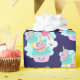 Wrapping paper with a cute illustration featuring a cupcake and ice cream smiling with joy. A rainbow and hearts surround the drawing. A cute fluffy cloud is also smiling with happiness. The cupcake and ice cream have a trendy unicorn horn on top. Cute and adorable design full of joy.