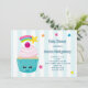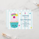 A baby shower invitation with a light blue and white striped background. Layered over top is a cute cupcake with a kawaii smiling face. A cherry on top also has a cute face. A shooting star is flying in the air. Some colourful stars decorate the design.