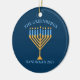 Cute custom Hanukkah ornament for a Jewish family gift or Chanukah party with a synagogue. Personalise with your own last name or group information in blue around the pretty blue menorah.