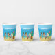 Cute personalised hula dancer girls on a beach for your luau party. Customise these pretty tropical island birthday party paper cups for a seaside celebration on the sand. Features a cool palm tree and dancing next to Tiki statues and blue water.