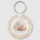 Round button keychain features your favourite photo surrounded with white leaves, berries and dots on an ivory background. TIP: Upload a high resolution photo that features your baby in the middle - you can crop to a square, too. Keychains make memorable gifts for family, grandparents and friends or create for yourself.