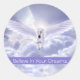 These beautiful stickers feature a majestic flying unicorn or Pegasus soaring up to the heavens, surrounded by puffy purple and grey clouds. The unicorn is pure white with large outstretched wings and seems to have light and rainbows glowing around its body. This design is customisable! You can personalise it with your own text. The default text says Believe in Your Dreams in white print on a purple background. Just hit the Personalise button to delete or enter your own text, or hit the Customise button to make any font or font colour changes and make it yours! This design is also available on postcards and other items. Makes a great gift, scrapbook item, or decoration for lovers of dreamy fantasy designs, unicorns, horses, Pegasus, rainbows and magic!