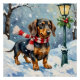 This charming design features an adorable Dachshund, often called a 'wiener dog,' bundled up for a cozy stroll in the snow. The beautiful watercolor art captures the playful spirit of the breed, wearing a festive red knitted scarf against a quaint, snowy backdrop. A delightful choice for Dachshund owners and fans of small, cheerful dog art. Perfect for holiday ornaments, personalized gifts, and adding a touch of rustic cheer to your Christmas decor.
