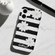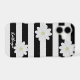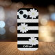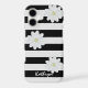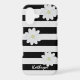 A black and white striped phone case with three cute daisy flowers and space for your name