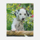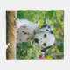 A cute seven weeks old black spotted Dalmatian puppy, standing in a wicker basket in a flowery garden. The puppy-eyed baby doggy was photographed by Katho Menden, this soft comfortably cosy fleece blanket is an enchanting gift idea for doglovers. http://www.zazzle.com/kathom_photo