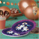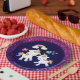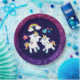 Paper plates with 2 cute dancing unicorns with bright and colourful tails, and mane. A colourful rainbow with clouds on each side above their heads. Other elements include a little flower a heart and some stars. Dark purple background and a faux-glitter image around the edges in purple and pink sparkly colours.
