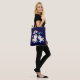 A tote bag with 2 cute dancing unicorns with bright and colourful tails, and mane. A colourful rainbow with clouds on each side above their heads. Other elements include a little flower a heart and some stars. Dark purple background.