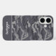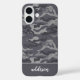 Cool camo print phone case features an allover camouflage pattern in shades of dark grey for a unique take on the camo trend. Personalise with a name along the bottom in white calligraphy script lettering.