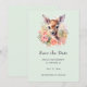 Save the date card with a beautiful illustration featuring a cute deer. Surrounded by pink roses and flowers.