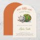 Adorable baby shower arch invitation with an illustration of a baby dinosaur or baby dragon about to hatch. Great for gender neutral baby showers since the colors are neutral green, orange and grey. Illustrated and designed by Patricia Alvarez.