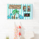 This boy's birthday banner features blue and teal stripes, a couple of dinosaurs, a palm tree and your son's photos.