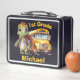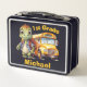 This is a cute lunch box for a boy featuring an adorable dinosaur with his backpack standing in front of a school bus. This lunch box is perfect for your child to carry their lunch to school every day. The text is customisable so you can personalise it to suit your needs.