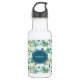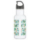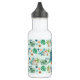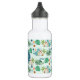 Cool, personalised dinosaur water bottle features a pattern of cute Tyrannosaurus (T rex), Triceratops, tropical monstera leaves, palm trees, volcano, bones, and "Roar!" text on a light blue background. Perfect for dino loving kids, back to school, sports and summer fun. Original artwork KL Stock