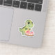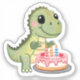 Make your prehistoric birthday celebration with this adorable dinosaur sticker! It features a cute green T-Rex happily standing next to a delicious pink birthday cake with three lit candles. This illustration embodies the excitement of a birthday party, complete with rosy cheeks and a big smile. Perfect for dinosaur themed parties, children's birthday cards, gift bags, or for decorating planners and scrapbooks. It's a dino-sus plus for any celebration!