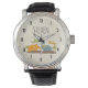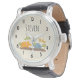 A watch with a cute design featuring 4 dinosaurs. 2 are flying and 2 are on the ground. Created with watercolors.