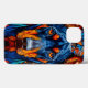 Striking and vividly colourful depiction of a dog's face, likely a Doberman. The dog’s fur is portrayed in deep blues and vibrant oranges, creating a bold and artistic contrast. The eyes are intensely luminous, drawing the viewer's attention, and the overall composition gives a sense of depth and texture.