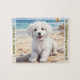 Cute jigsaw puzzle featuring an adorable white dog Great Pyrenees puppy on the beach. Makes a cute personalised stocking stuffer or birthday gift for kids and all the dog lovers. Comes with a cardboard carry-case with a puzzle image printed on the lid! Easily personalise the text or leave it blank. - Kate Eden Art