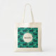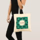A patterned tote bag with a custom name inside a white circle. Designed with a repeating pattern featuring a cute smiling doggy with a bone. Green background.
