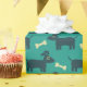 Wrapping paper designed with a repeating pattern featuring a cute smiling doggy with floppy ears and a dog bone. Green background.