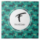 A ceramic tile personalised with a monogram initial and a name and designed with a repeating pattern featuring a cute smiling doggy with floppy ears and a dog bone. Green background.