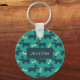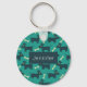 A personalized keychain designed with a repeating pattern featuring a cute smiling doggy with floppy ears and a dog bone. Green background.