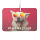 "Where we going?" text over a cute dog photo (can be changed to your dog) on a fun air freshener. An affordable gift for family, friends or create for yourself, they are double-sided and available in different shapes and several amazing long lasting, odour eliminating scents.