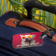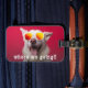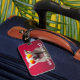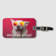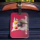 "Where we going?" text over a cute dog photo (can be changed to your dog) on a fun luggage tag with a slot for a business card on the back.