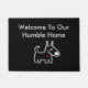 Here's a cute home welcome mat with an adorable hand drawn dog with a red heart shape and text that says Welcome To Our Humble Home. A dog lovers favourite for welcoming guests, family, and friends to your home in a warm and friendly way.