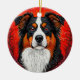 Dog's face set against a bold red circular background. The dog features distinct markings with black, brown, and white fur, and striking orange eyes, giving it an expressive and captivating look.