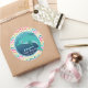 Personalise this cute, custom baby shower sticker with underwater aquatic cartoon dolphin and colourful teal, pink, yellow, orange, and blue chevron stripes background by adding mummy to be's name. It's a great neutral sticker for boy or girl ocean, sea life theme showers. Smaller stickers can be used as envelope seals for baby shower invitations or thank you cards. Use this cool baby shower sticker on party favours, gifts, and decorations, decor.