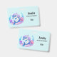 Name badge with an adorable illustration. A blue and purple dolphin surrounded by pretty colourful underwater plants.