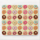 Deliciously cute multi-coloured illustrated doughnut pattern on soft pastel polka dot background.