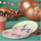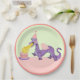 Creative dragon birthday party plates featuring funny purple and pink fires-breathing dragon blowing out the candles on a cute birthday cake. Add your text to personalise.