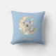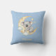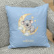 This personalised boys' throw pillow features a cute baby koala curled up sleeping on a crescent moon with glowing stars in a whimsical pastel blue background.