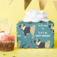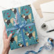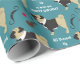 An adorable black and tan pug wears a tuxedo jacket on this cute birthday wrapping paper. Beside him are images of a moustache, a pair of eyeglasses, a pipe, and a red heart. The white text says "All dressed up to wish you a Happy Birthday". The images and the text are placed on a teal green background.