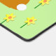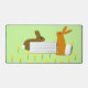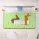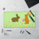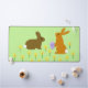 This awesome desk mat features a pair of cute little Easter bunnies surrounded by yellow daffodil flowers. The rabbits are brown with big ears, black eyes and fluffy white tails. One of the bunnies is holding an Easter egg with a pretty purple bow on it and is reaching out to offer it to the other bunny. The daffodils are yellow with a bright orange centre.