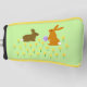 This awesome golf putter cover features a pair of cute little Easter bunnies surrounded by yellow daffodil flowers. The rabbits are brown with big ears, black eyes and fluffy white tails. One of the bunnies is holding an Easter egg with a pretty purple bow on it and is reaching out to offer it to the other bunny. The daffodils are yellow with a bright orange centre.