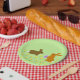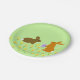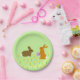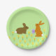 This awesome paper party plate features a pair of cute little Easter bunnies surrounded by yellow daffodil flowers. The rabbits are brown with big ears, black eyes and fluffy white tails. One of the bunnies is holding an Easter egg with a pretty purple bow on it and is reaching out to offer it to the other bunny. The daffodils are yellow with a bright orange centre.
