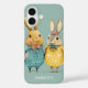 Cute Easter bunny couple iPhone 16 case. Wonderful spring colours in yellow and green / blue tones, a couple of super cute Easter bunnies in fancy clothes carrying eggs and spring flowers. Personalised text with a lovely trendy script.