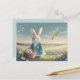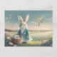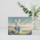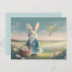 Cute Easter bunny in little blue jacket with easter egg basket in a field of wild flowers