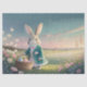 Cute Easter bunny in little blue jacket with easter egg basket in a field of wild flowers