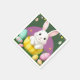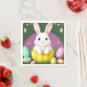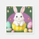 Holiday-themed illustration featuring a cheerful white bunny surrounded by colourful Easter eggs and grass.