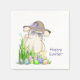 Easter bunny wearing hat and sunglasses with eggs and flowers in grass